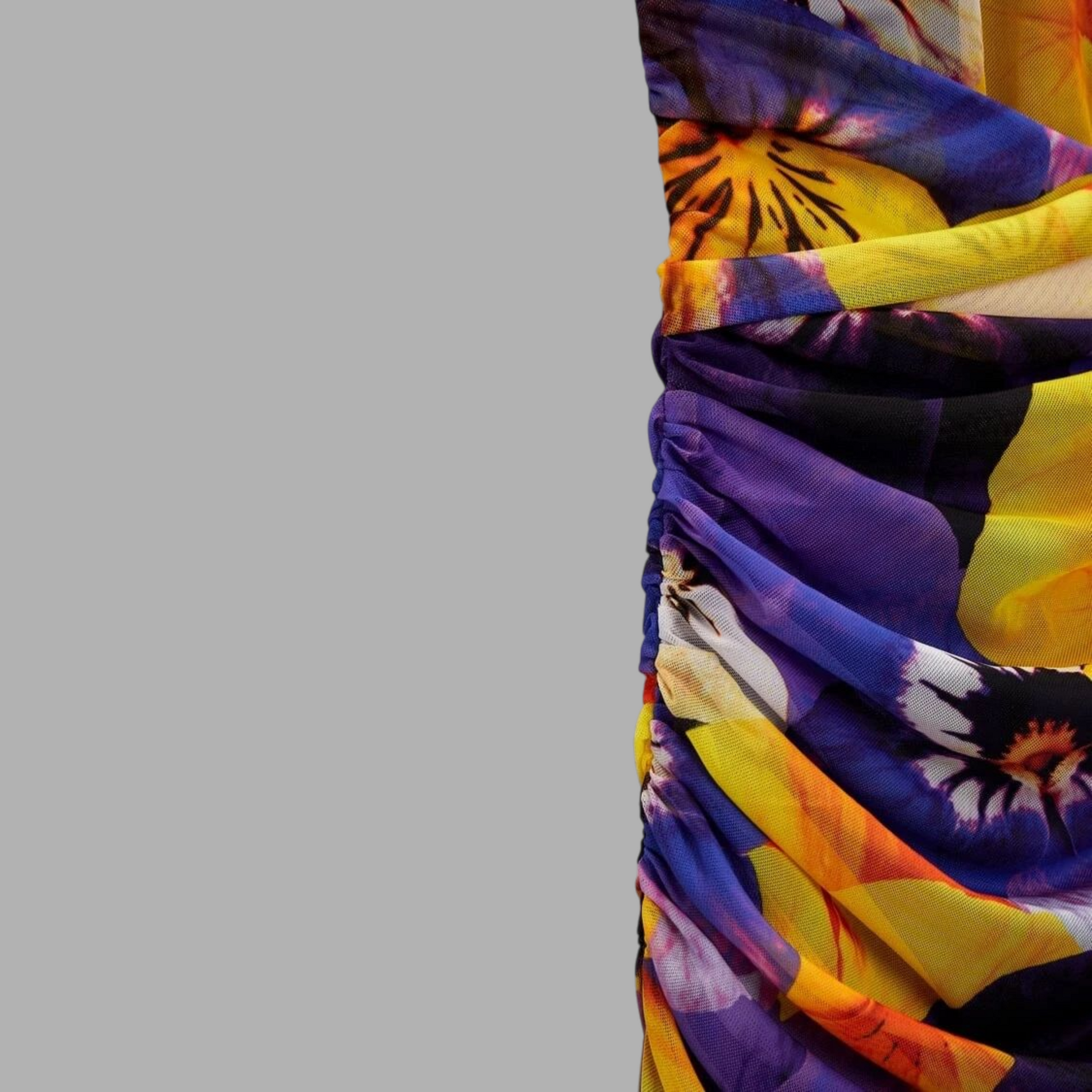 Available in four sizes – XS, S, M, and L – you’ll easily find the perfect fit. With its captivating violet and yellow print, this dress is a wardrobe essential for those who love to blend timeless beauty with modern flair.